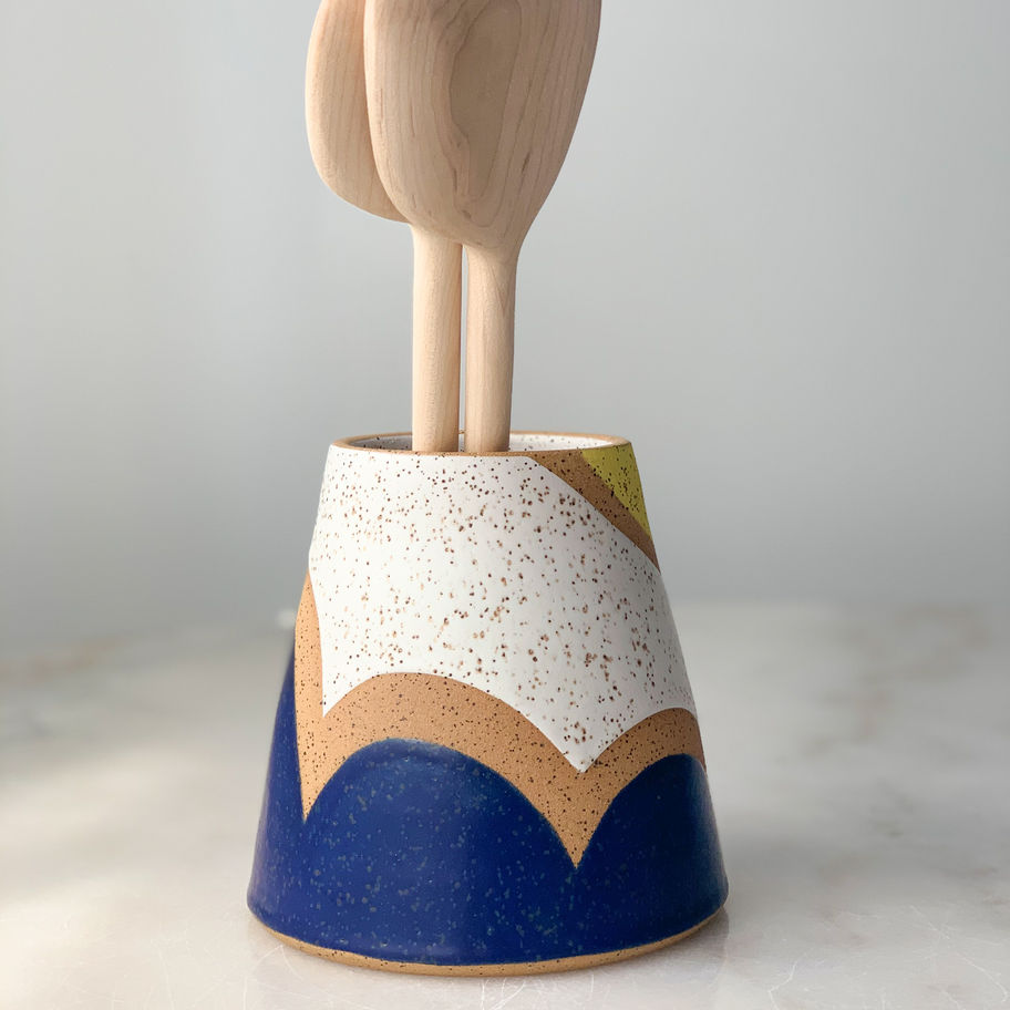 Classic Oh Happy Day colors of yellow, blue, and white over speckled southwestern clay